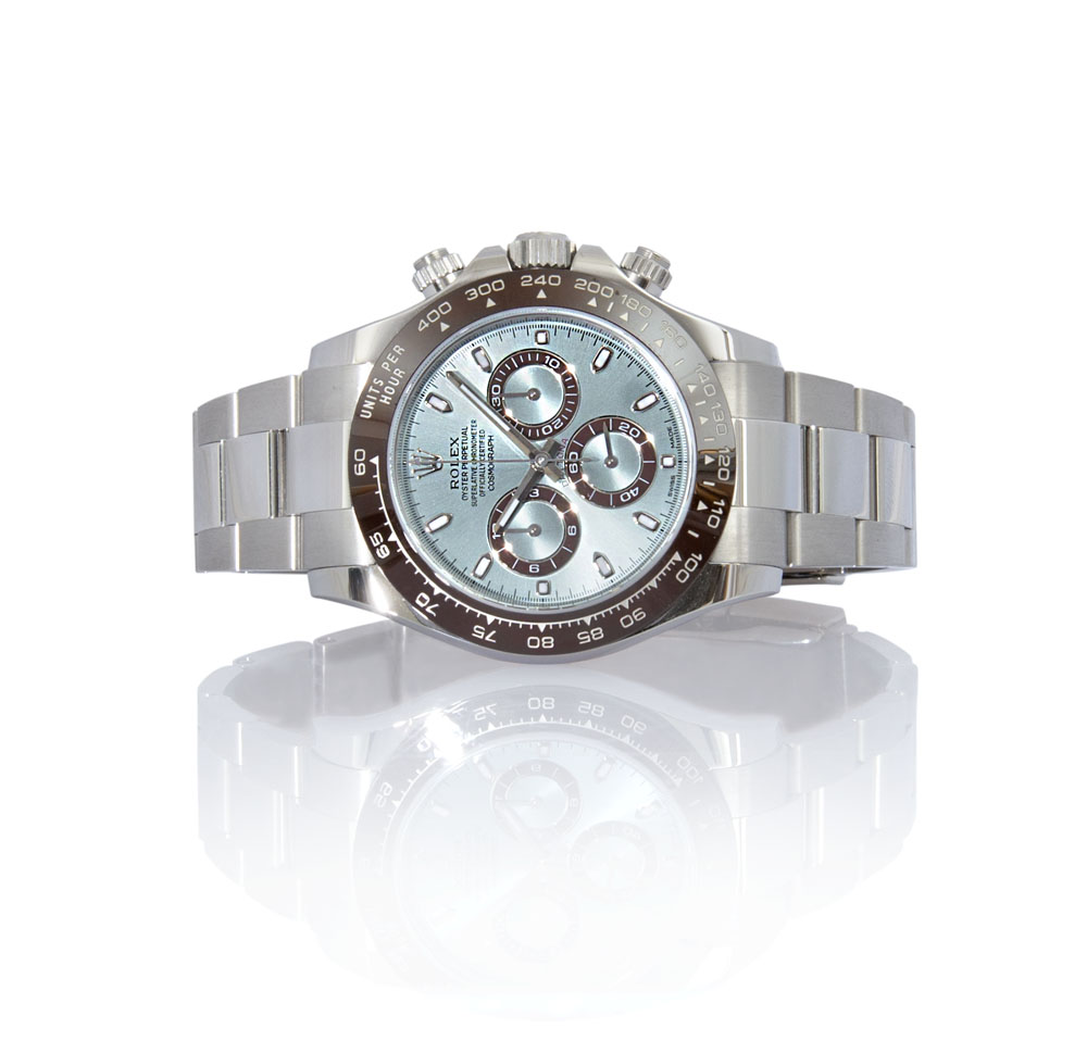 C. n. 17KK0608 in platino con fondello, corona e pulsanti a vite, lunetta Cerachrom marrone con scala tachimetrica, vetro zaffiro. Q. bicolore azzurro ghiaccio e marrone con indici applicati e lancette luminescenti, contatore a 30 minuti e 12 ore. M. a carica automatica. Bracciale Oyster Fliplock in platino. Quadrante, cassa, movimento e bracciale firmati. Completo di astuccio originale e certificato di Bucherer.