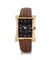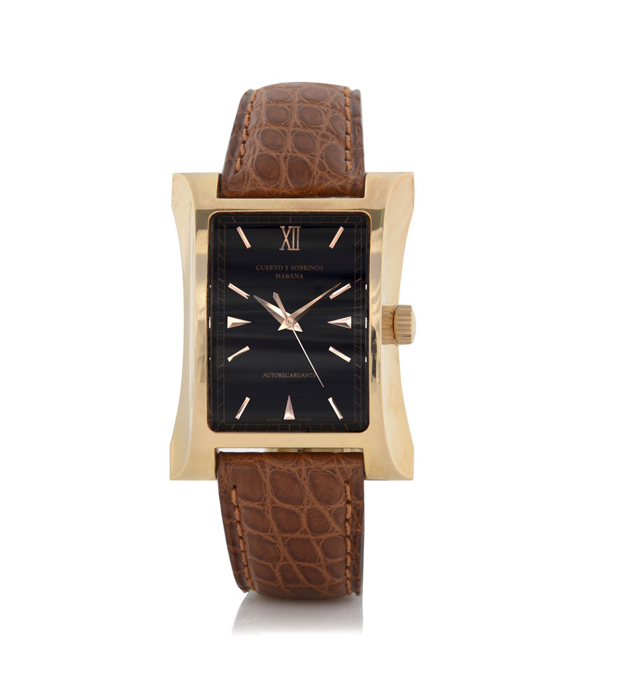C. rectangular with concave sides, 18K pink gold with case back secured by screws, curved sapphire crystal. D. black with applied indexes and Roman numeral, centre seconds. M. self-winding. Dial, case and movement signed. Accompanied by Cuervo Y Sobrinos strap and 18K pink gold buckle.