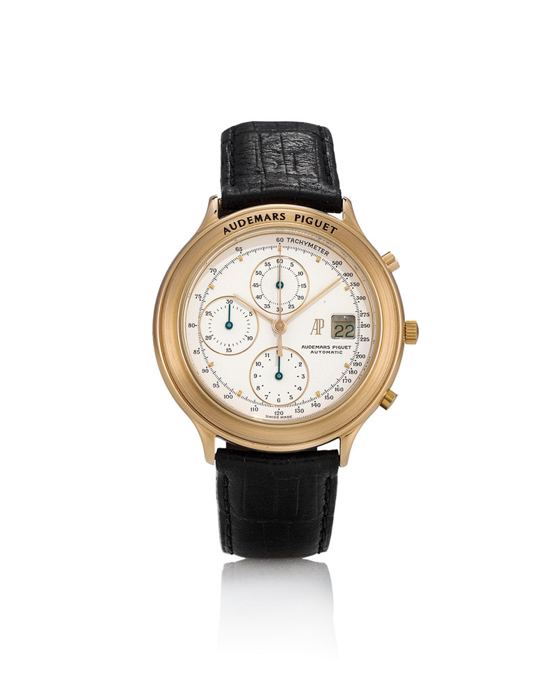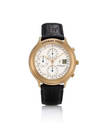 C. solid, 18K pink gold with round buttons. D. silvered with applied indexes, 30 minute and 12 hour registers, date at 3, tachymetre scale. M. self-winding. Dial, case and movement signed. Accompanied by 18K pink gold Audemars Piguet buckle.