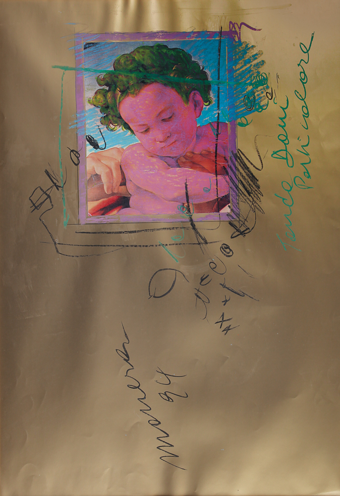 ENRICO MANERA Asmara (Etiopia) 04/04/1947 Tondo Doni particolare, 1994 tecnica mista e collage su cartoncino fondo dorato cm. 100x70, firma e anno in basso al centro, certificato della Galleria d'Arte Skorpios (Roma) allegato, dichiarazione d'autenticità dell'artista e archivio Meeting Art (Vc) su foto.