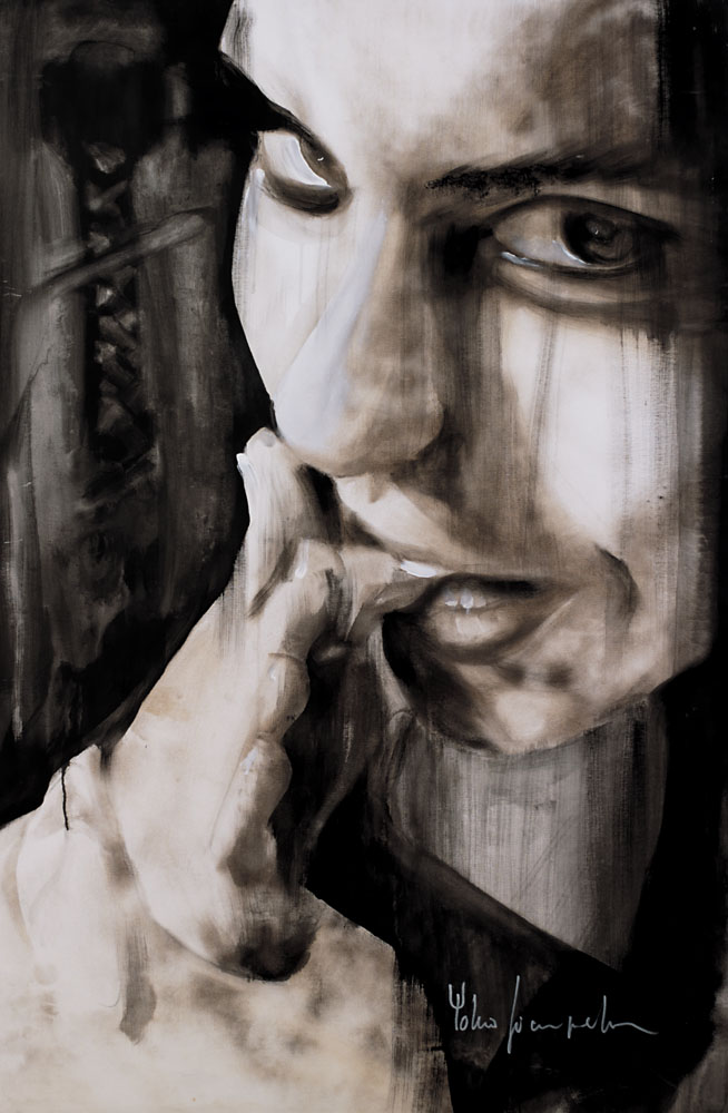 FABIO GIAMPIETRO Milano 1974 Donna con piede, 2002 tecnica mista su tela cm. 150x100, firma in basso a destra, firma, anno ed etichetta della Transit Artist Management al retro, opera senza cornice.