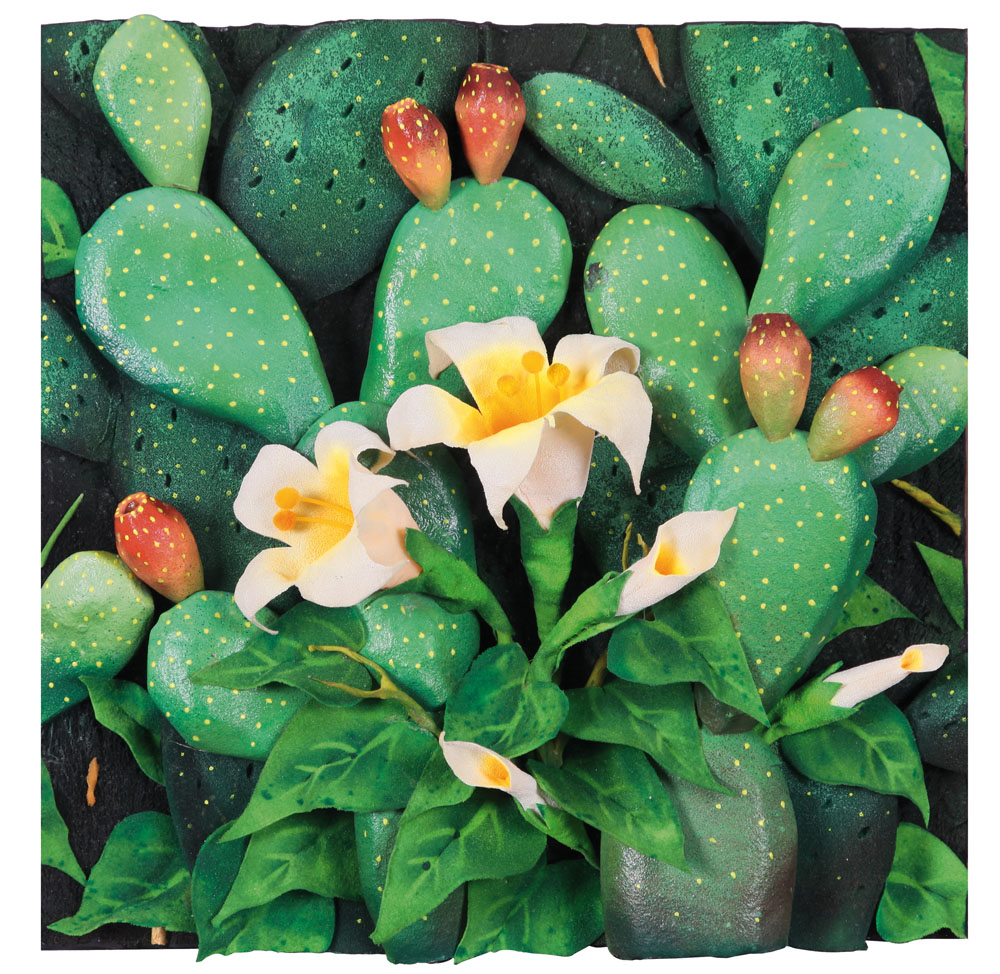 PIERO GILARDI Torino 03/08/1942 Fiori e fichi d'india poliuretano espanso cm. 50x50, firma e titolo al retro, dichiarazione d'autenticità dell'artista e timbro della Galleria Giudi & Schoen su foto, entro teca in plexiglass.