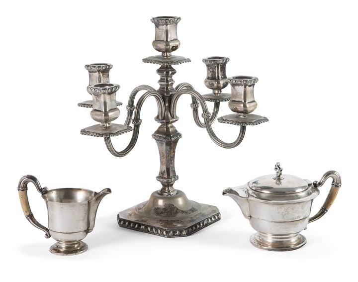 Composto da: una teiera ed una lattiera con manici in parte in osso e un candeliere a cinque luci