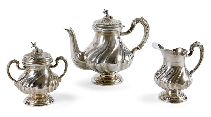 Composto da una caffettiera, una zuccheriera e una lattiera, corpo bombato; prese a forma di fiore
