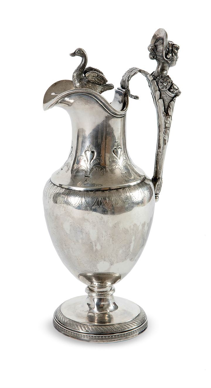 Corpo bombato, presa a forma di cigno, manico in argento terminante con busto femminile.