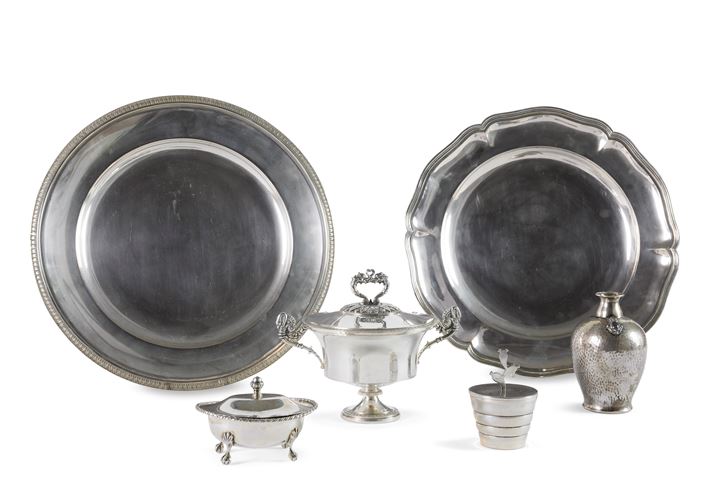 LOTTO DI SEI OGGETTI IN ARGENTO Peso gr 2366 Composto da due piatti rotondi,...