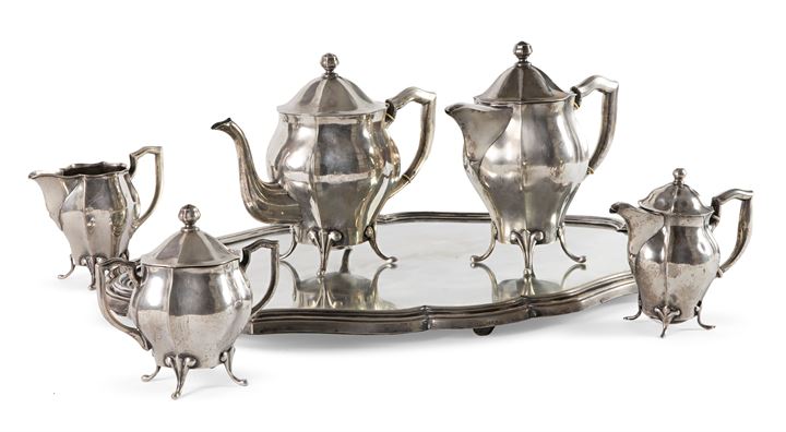 Composto da: due caffettiere, teiera, lattiera, zuccheriera e un vassoio. Struttura di forma geometrica, corpi bombati, poggianti su quattro piedini. Quattro pezzi con punzoni del "Fascio".