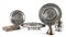 Composto da: una zuccheriera con coperchio; una campanella con presa a forma di leone; una scatola in legno rivestita in argento; due piatti di forma rotonda, uno liscio (diam. cm 21 ) e l'altro cesellato e sbalzato a motivi vegetali (diam. cm 31,5); un'alzata di forma mossa poggiante su tre piedini