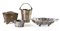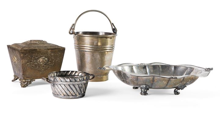 Un centrotavola polilobato poggiante su quattro piedini; un secchiello con manico; una scatola interamente cesellata a motivi vegetali, interno dorato, poggiante su quattro piedini, con coperchio incernierato recante al centro un'agata di forma ovale
