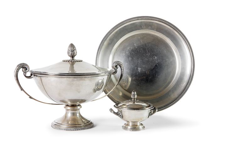 Lotto composto da una grande zuppiera con coperchio, un piatto in argento in stile Impero e