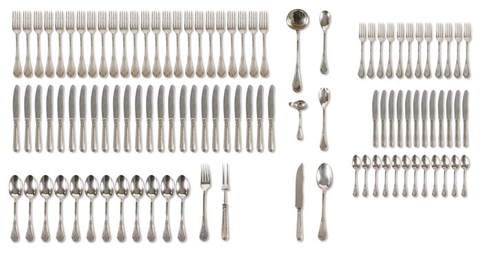 Composto da: 24 coltelli grandi, 24 forchette grandi, 12 cucchiai grandi; 12 forchettine; 14 coltellini; 12 cucchiaini e 8 posate da portata. Totale pezzi 106