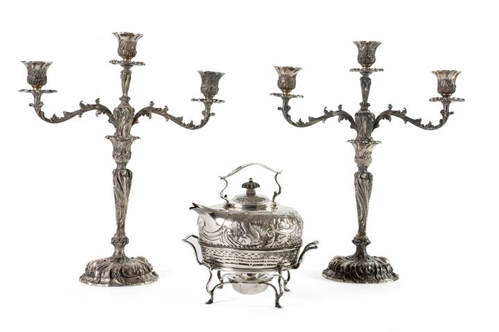 - Coppia di candelieri in argento a tre luci di gusto barocco, peso gr. 2210