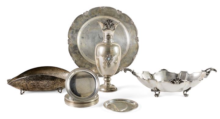 Lotto 715 | LOTTO DI SEDICI OGGETTI IN ARGENTO Peso gr 3934 Composto da: un vaso con...