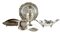 Composto da: un vaso con corpo bombato e applicazioni in pietre dure, poggiante su base circolare; 12 sottobicchieri; un grande piatto rotondo, bordo mosso con decori a volute; due alzate di cui una con punzone "del Fascio", poggianti su quattro piedini