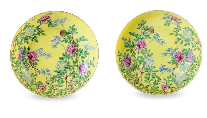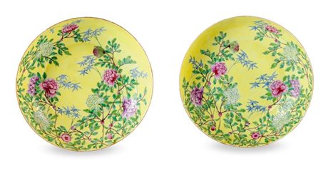 Cina, XIX secolo, in porcellana a buccia d'uovo decorati a motivi floreali su fondo giallo