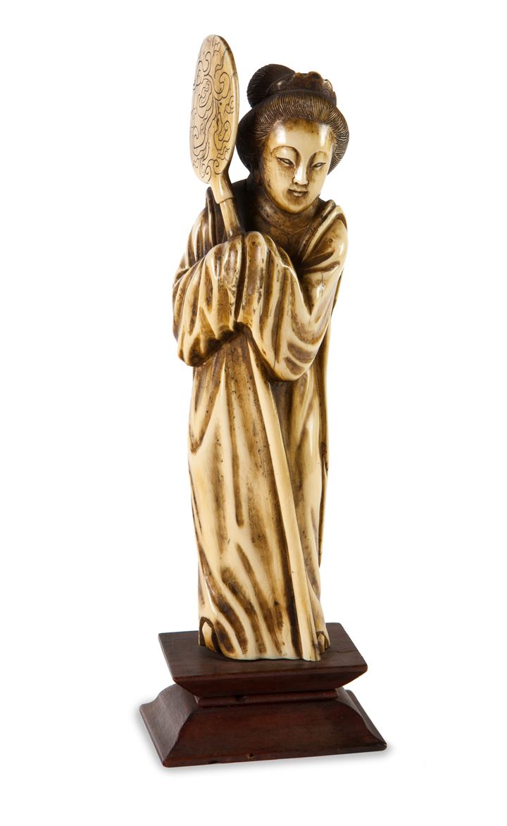 Poggiante su base lignea, raffigurante giovane donna con ventaglio