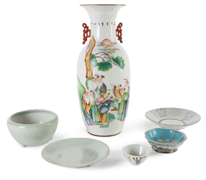 composto da: un vaso cinese, decorato con figure di dignitari e scritte, H cm 58; due piatti e tre ciotole di cui una Celadon