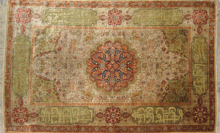 TAPPETO 117x183 seta e fili metallici "Koum Kapi Rug", XIX secolo; fondo...