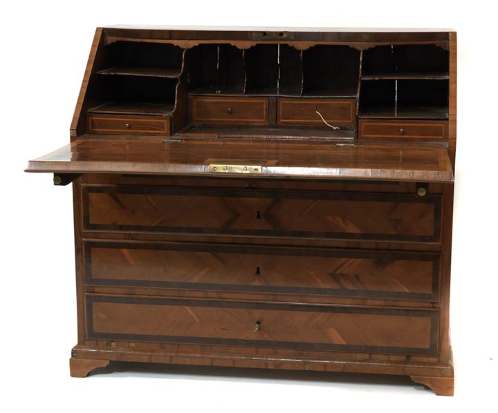 Fronte a tre cassetti e calatoia celante quattro tiretti, vano porta carte e pianetti.