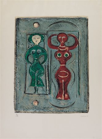 MASSIMO CAMPIGLI Berlino 04/07/1895 - St. Tropez (Francia) 31/05/1971 Composizione con due figure, 1965 litografia a colori (ocra, tre verdi, rosso bruno, turchese e nero) su carta Rives cm. 53,5x41,5 (foglio intero cm. 76,5x56), esemplare 48/210, firma in basso a destra, pubblicata su "Campigli, catalogo ragionato dell'opera grafica (litografie e incisioni) 1930-1969", a cura di Francesco Meloni e Luigi Tavola, Edizioni Graphis Arte, pagina 167 al numero 197.