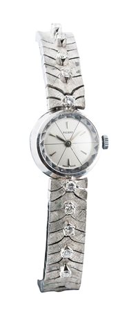 Cassa in due parti in oro bianco con bracciale integrato a segmenti snodati, impreziosito da 10 diamanti taglio brillante. Quadrante con indici applicati