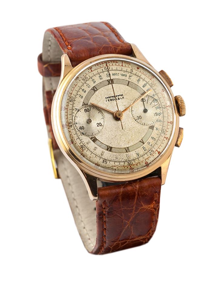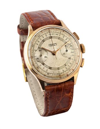 LEBOIS Cronografo a due contatori, anni '50 Diam. 36 Cassa in oro rosa in tre...