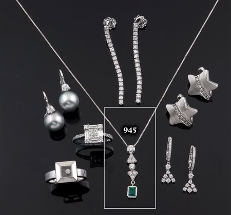 in oro bianco con diamanti taglio brillante per complessivi ct 0,30 ca disposti in verticale terminante con smeraldo taglio ottagonale di ct 0,35 ca