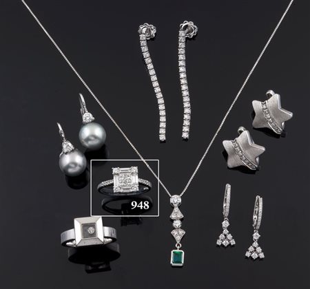 in oro bianco, sommità di forma quadrata, con diamanti taglio baguette, princess e rotondo per complessivi ct 1,0 ca