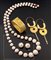 composta da coppia di orecchini, a lobo, in oro giallo con coralli pelle d'angelo lavorati a torchon e collana composta da sfere lavorate a torchon di corallo rosa dal diam di mm 7,7 a 18,3. Chiusura in oro giallo, distanziali con piccoli diamanti neri briolette
