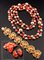 composta da spilla e coppia di orecchini in oro a bassa caratura, lavorati a tralci d'uva con sfere e foglie in corallo di Sciacca