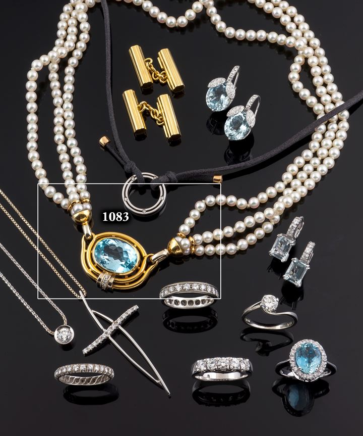 composto da girocollo a tre fili di perle giapponesi del diam di mm 4,5. Chiusura in oro giallo con topazio azzurro ovale e piccoli diamanti taglio brillante