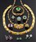 In oro giallo, sommità a forma di losanga, al centro smeraldo taglio smeraldo e diamanti taglio brillante di vecchio taglio e taglio a cuore per complessivi