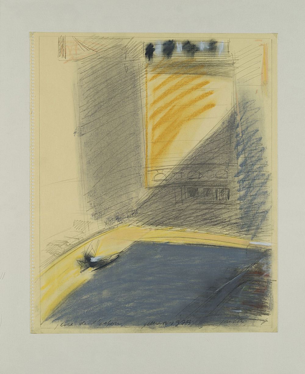 Piero Guccione (Scicli 1935) - "Place de l'odeon" 1979 tecnica mista su carta, cm 45,5x37,8 Firmato e datato 1979 in basso a destra. Titolato in basso a sinistra