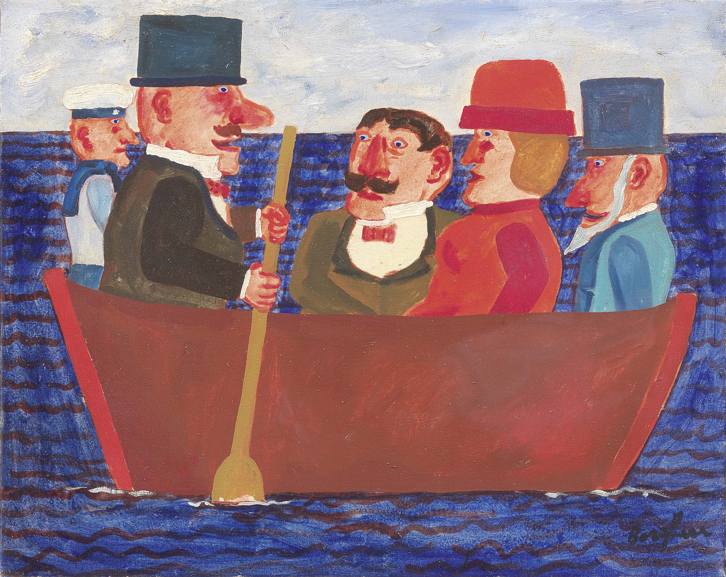 Franz Borghese Roma 1941 - 2005 La gita Olio su tela, cm. 39,7x59,8 Firma in basso a destra: Borghese; firma al verso sulla tela: Franz Borghese; sulla cornice: etichetta Sant'Erasmo Club d'Arte, Milano, con n. FB8.