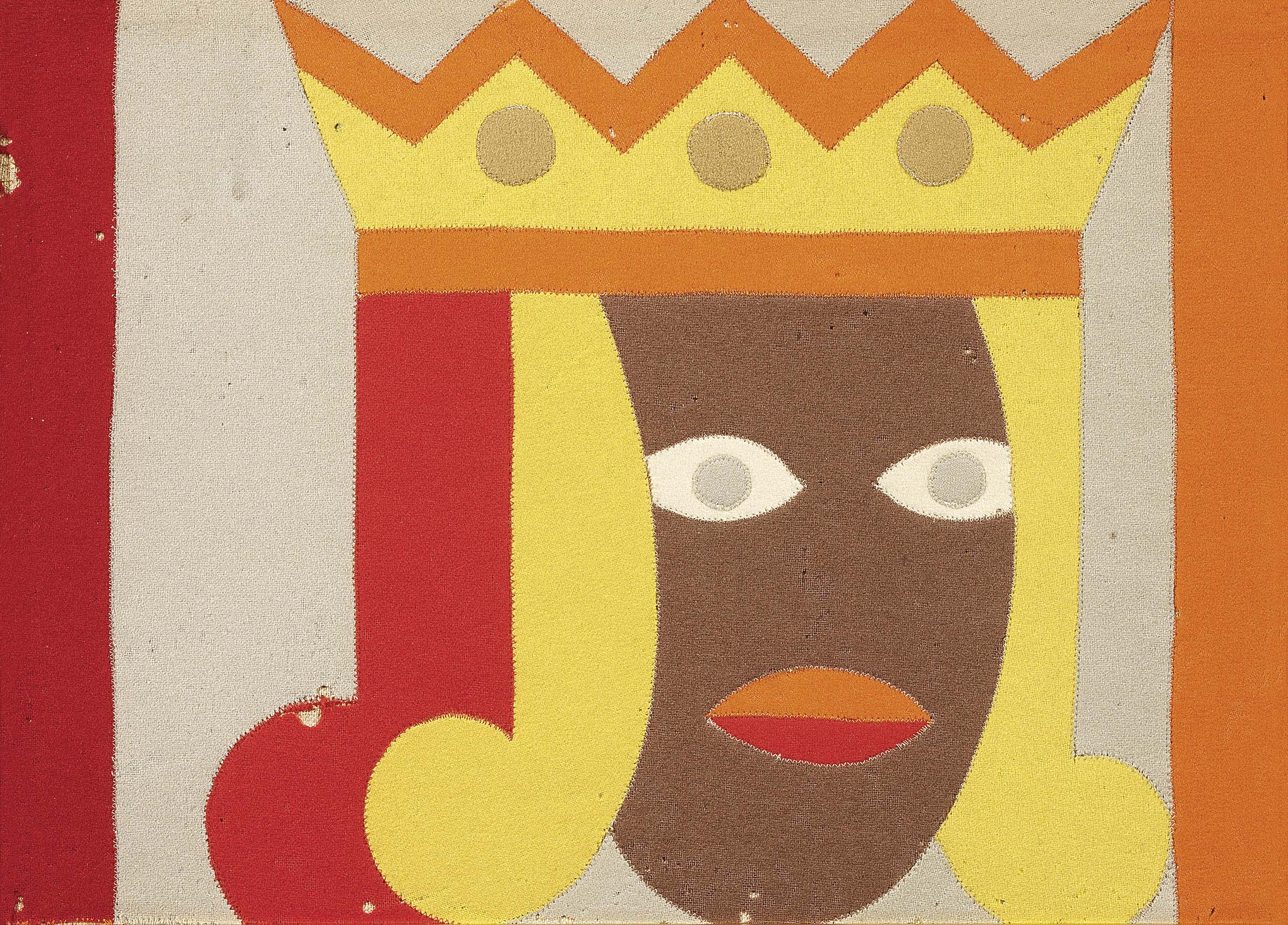 Fortunato Depero Fondo, Val di Non (Tn) 1892 - Rovereto (Tn) 1960 Re di Denari, 1932 ca. Tarsia di stoffe colorate su canovaccio di tela olona, cm. 31,5x43,5 Certificato con foto Archivio Unico per il Catalogo delle Opere Futuriste di Fortunato Depero, Rovereto, 10 giugno 2013, con n. FD-0224-STO.