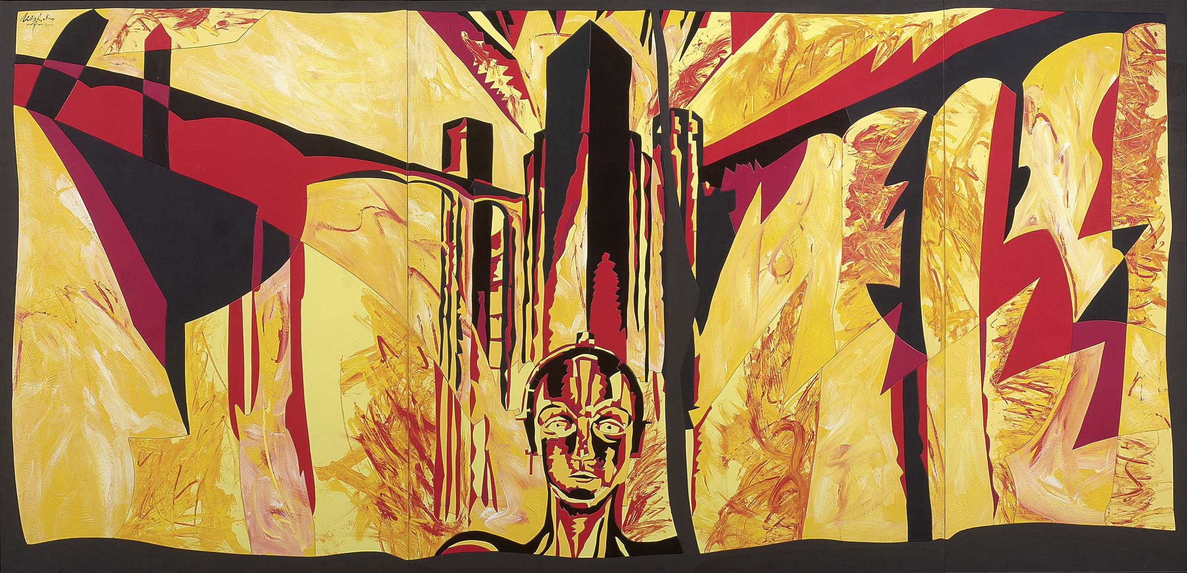 Ugo Nespolo Mosso (Bi) 1941 Metropolis Acrilico su tarsie in legno, cm. 140x290 Firma in alto a sinistra: Nespolo. Foto autenticata dall'artista, con n. 2868. Esposizioni: Nespolo: Cinenespolo, Locarno, Palazzo Casorella, 2003, cat. p. n.n., illustrato a colori.