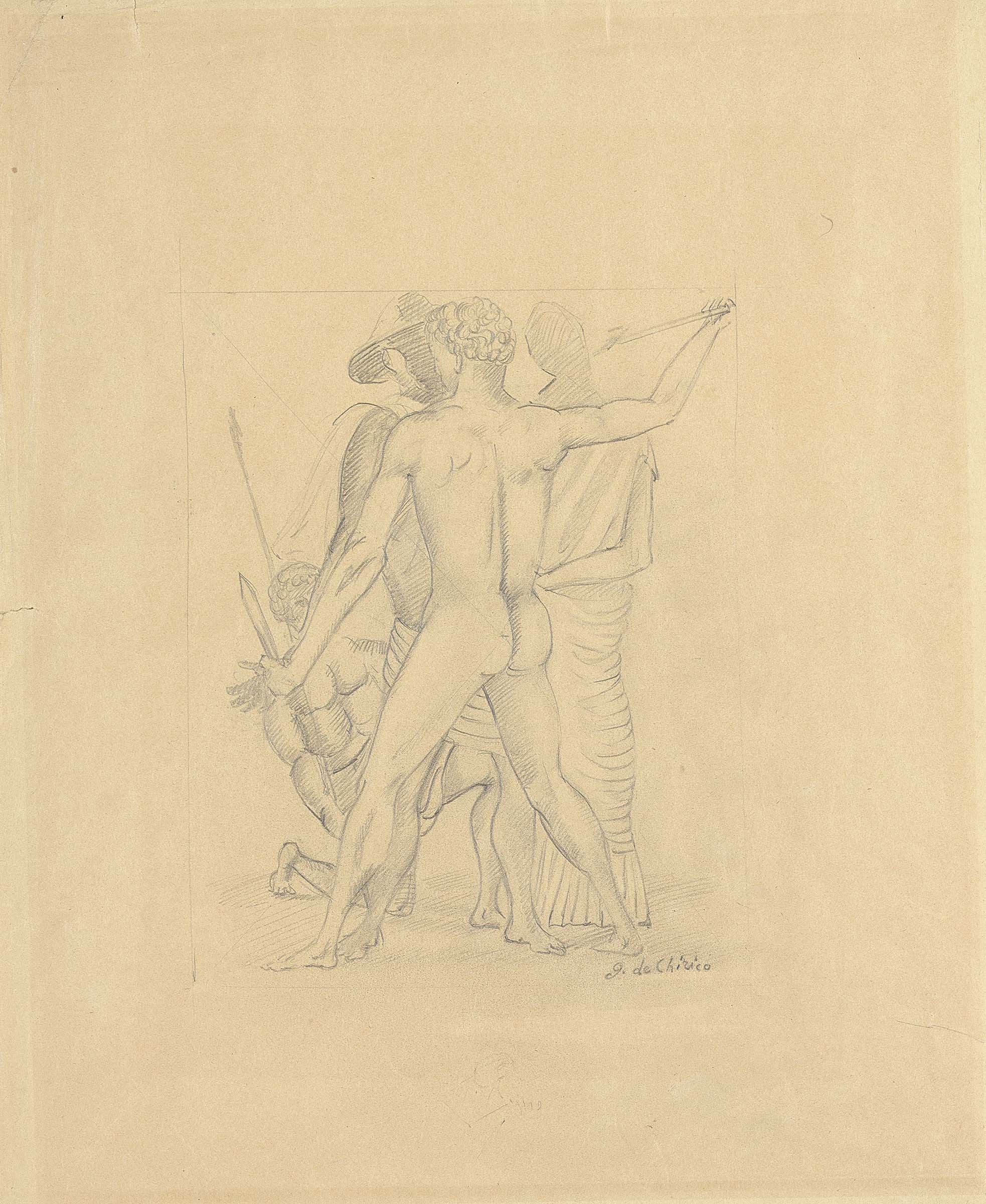 Giorgio de Chirico Volos 1888 - Roma 1978 Combattimento di gladiatori, seconda metà anni Quaranta Matita su carta, cm. 44,5x36 Firma in basso a destra: G. de Chirico; dedica al verso: a [...] / con auguri / Giorgio de Chirico. Storia Collezione privata, Milano; Collezione privata Certificato su foto di Claudio Bruni Sakraischik, Roma 27 settembre 1982, con n. 113/82.