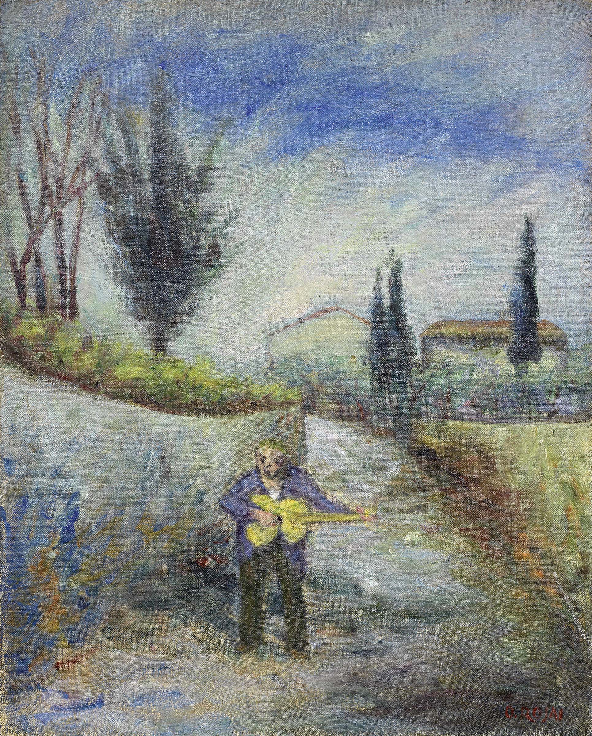 Ottone Rosai Firenze 1895 - Ivrea (To) 1957 Cantastorie, 1946-47 ca. Olio su tela, cm. 75,4x60 Firma in basso a destra: O. Rosai. Al verso sul telaio: cartiglio Prof. Dott. V. Nazzi / Torino: cartiglio con dati dell'opera: etichetta Studio DueCi Arte Moderna Roma, con n. archivio RP24F86. Storia Collezione V. Nazzi, Torino; Collezione privata Certificato su foto di Luigi Cavallo, Milano, 25-11-1983.