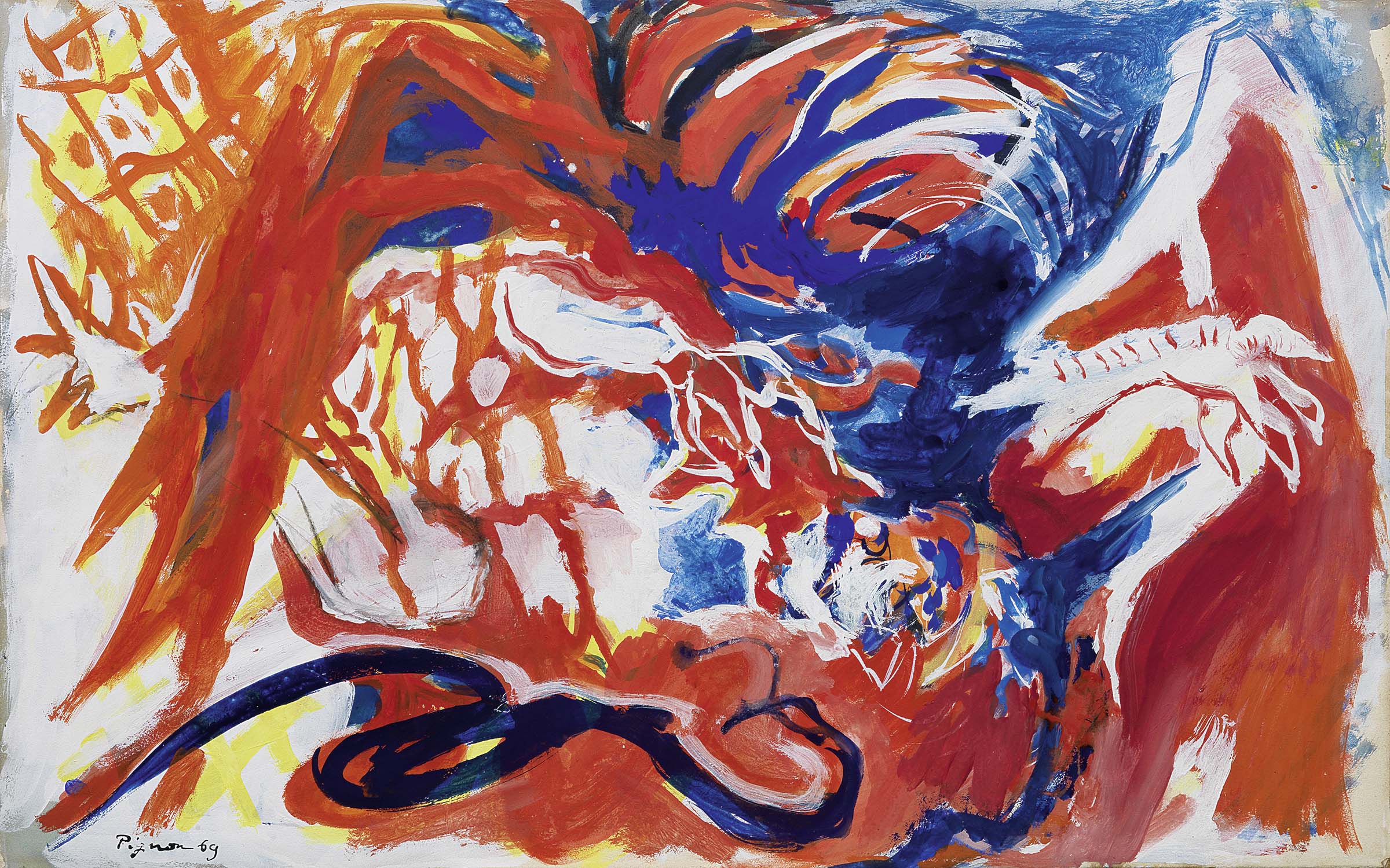 Edouard Pignon Marbles-les-Mines 1905 - Parigi 1993 Combat de coqs, 1969 Gouache su carta applicata su tela, cm. 49,5x78 Firma e data in basso a sinistra: Pignon 69. Al verso sul telaio: timbro Galleria De Cillia, Udine. Storia Atelier dell'artista, 1969; Collezione De Cillia, Udine; Collezione privata Esposizioni Pignon, Milano, Farsettiarte, 14 marzo - 23 aprile 1990, cat. n. 8; Pignon, Cortina d'Ampezzo, Galleria d'Arte Frediano Farsetti, 21 febbraio - 8 marzo 2004, cat. n. 6.