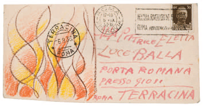 Giacomo Balla Torino 1871 - Roma 1958 Cartolina, 1933 matita e inchiostro su cartoncino, cm 8x16,8. Provenienza: Milano, Quadreria d’Arte Contemporanea; collezione privata. Bibliografia: L. Marcucci, Giacomo Balla. Dal divisionismo al futurismo, Milano 1981, pagina 55, riprodotto. Autentica su fotografia di Luce Balla.