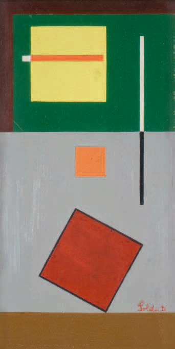 Atanasio Soldati Parma 1896 – 1953 Composizione, 1936 olio su tavola, cm 25x14. Firmata in basso a destra: Soldati Provenienza: Bergamo, Galleria Lorenzelli (etichetta e timbro al verso); Bergamo, Galleria dei Mille (etichetta e timbro al verso); Milano, Galleria Bergamini (timbro al verso). Esposizione: Torino, Galleria Civica d’Arte Moderna, Atanasio Soldati, Torino, 6 novembre 1969 - 6 gennaio 1970. Bibliografia: L. Mallè - N. Ponente, Atanasio Soldati, catalogo della mostra, tavola 56, riprodotto.