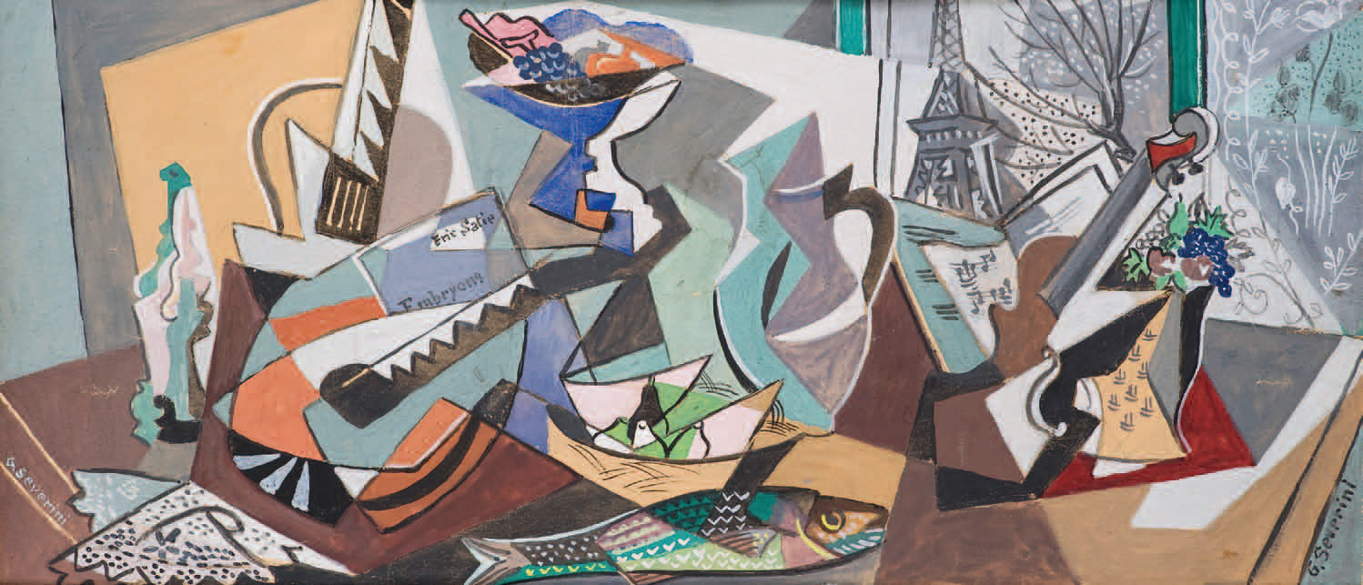Gino Severini Cortona, Arezzo 1883 – Parigi 1966 Natura morta (Eric Satie), 1954 circa gouache su carta intelata, cm 19,5x41,5. Firmata in basso a destra e sinistra: G. Severini Iscritto al verso: Gino Severini Paris 16-3-1963 Opere registrata presso l’Archivio Gino Severini in data, Roma 15 aprile 2015.