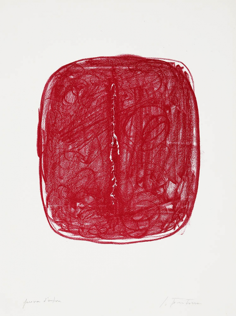 LUCIO FONTANA 1899 - 1968 " Concetto spaziale ", 1967 Litografia stampata in rosso con strappi, cm. 47 x 35 Firmato in basso a destra Prova d'artista BIBLIOGRAFIA: " Lucio Fontana, incisioni ... ", Harry Ruhé e Camillo Rigo, Reverdito Edizioni, 2007, p. 114 Prov. Collezione Privata
