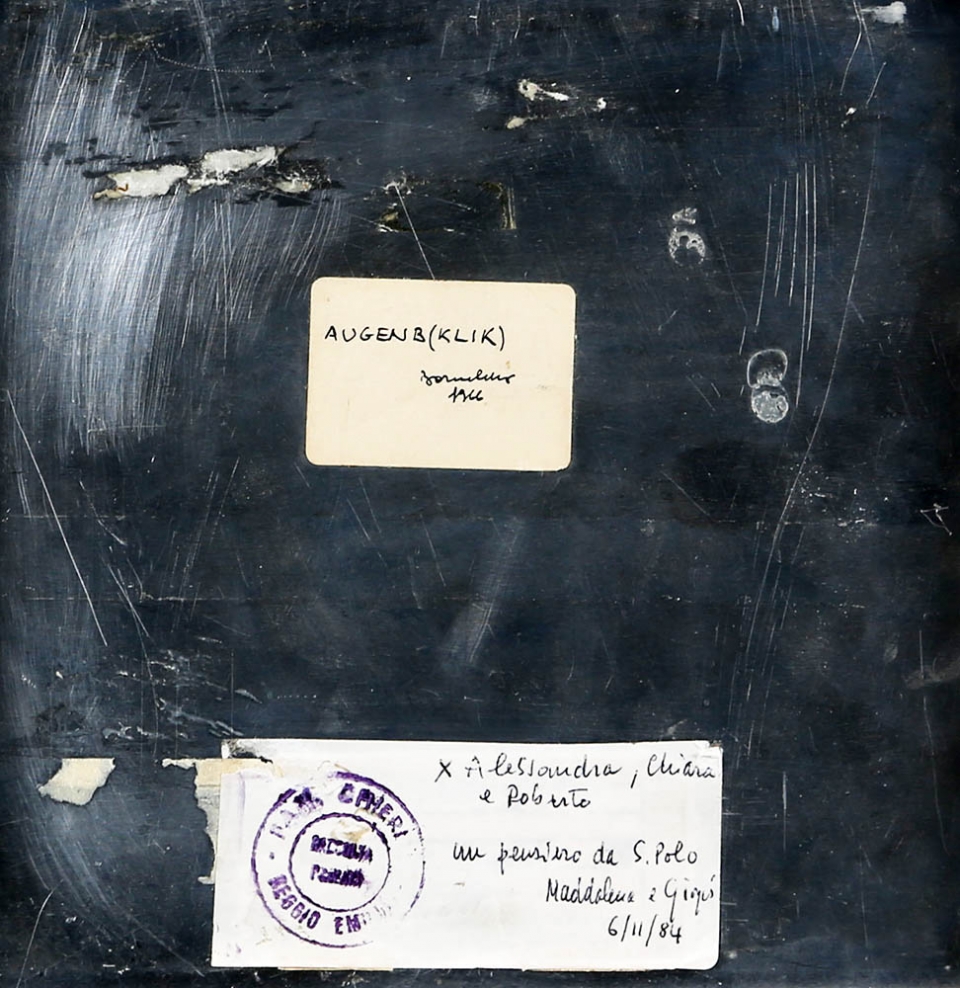 GIANFRANCO BARUCHELLO 1924 " Augenb (klik) ", 1966 Smalti e collage su alluminio, cm. 20 x 20 Firmato e datato sul retro Dedica dell'artista sul retro Prov. Collezione Privata