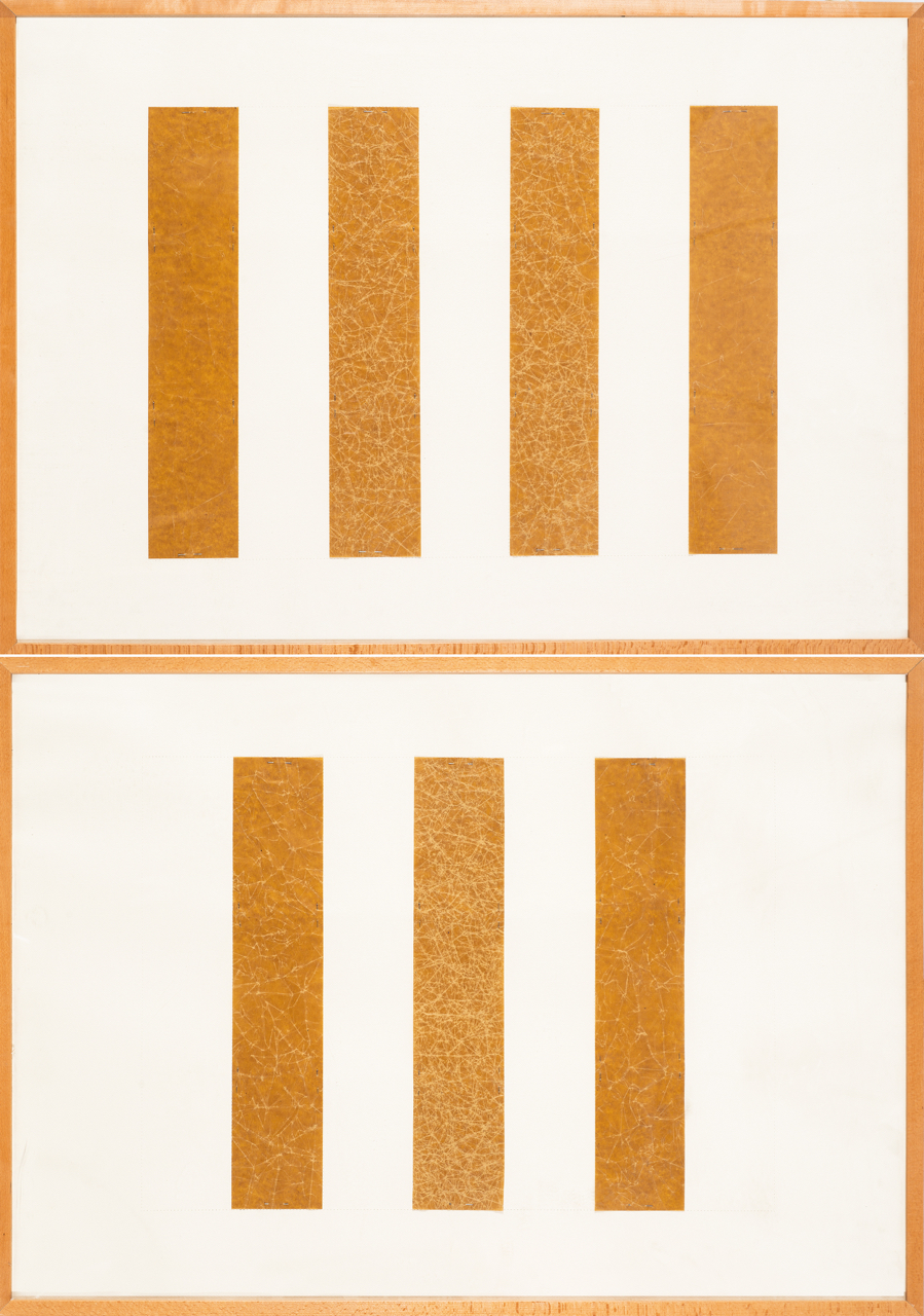 Nanni Cortassa (1945) Sequential symmetrical combinations Firmato e datato Nanni Cortassa 1975 sul retro lungo il bordo dei due elementi Collages di carta oleata e piegata con spilli su 2 fogli di carta cm 140x100 (opera completa) - cm 70x100 (ciascun foglio) Eseguito nel 1975 Titolo sul retro lungo il bordo dei due elementi Provenienza: Artiscope Gallery, Bruxelles