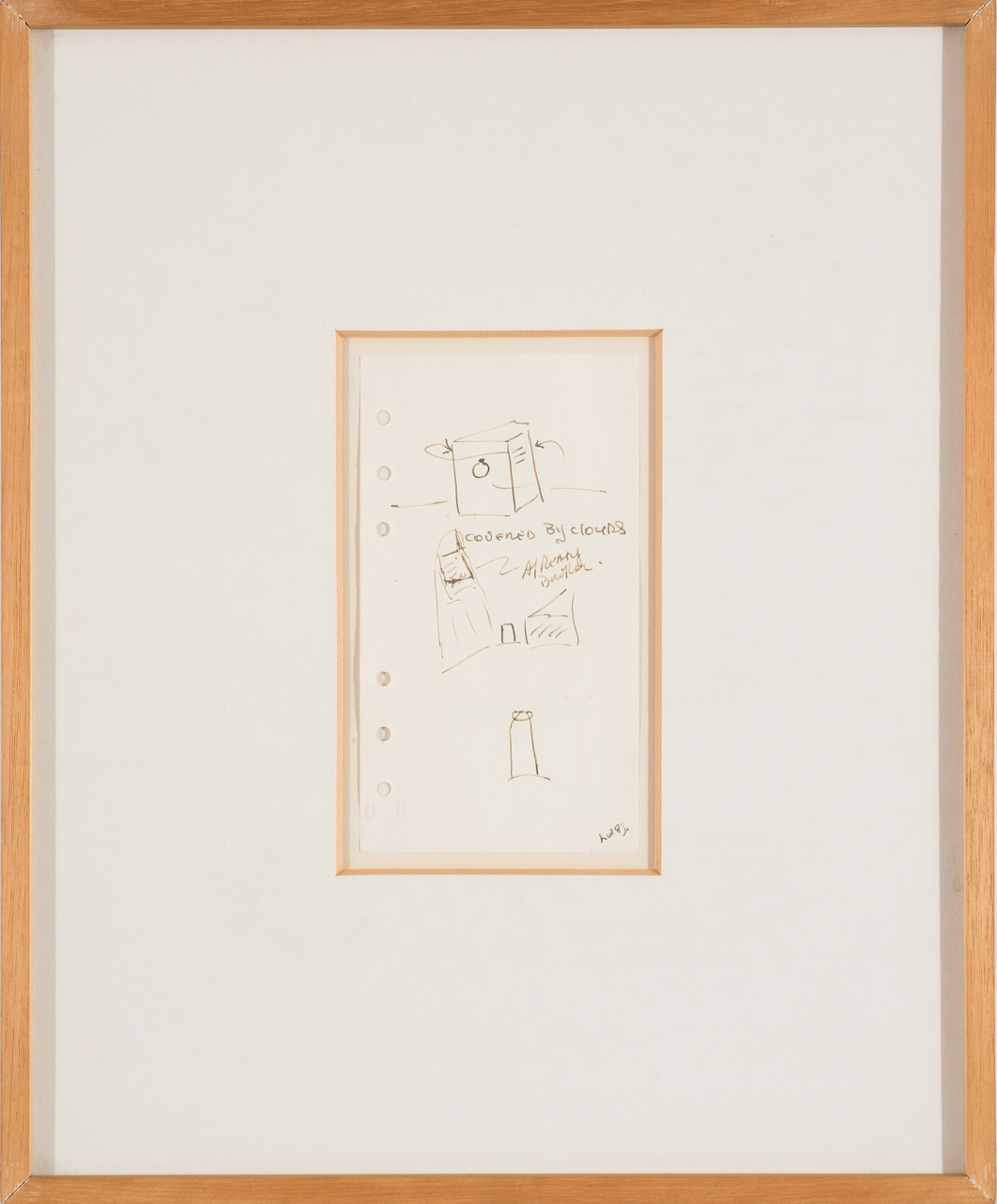 Lawrence Weiner (1942) Covered by clouds Firmato e datato L. W. 89 in basso a destra Inchiostro e collage con passepartout in cornice di legno cm 41x33,5 (cornice) - cm 17x9,6 (disegno) Eseguito nel 1989 Titolo al centro Provenienza: Galleria Christian Stein, Milano