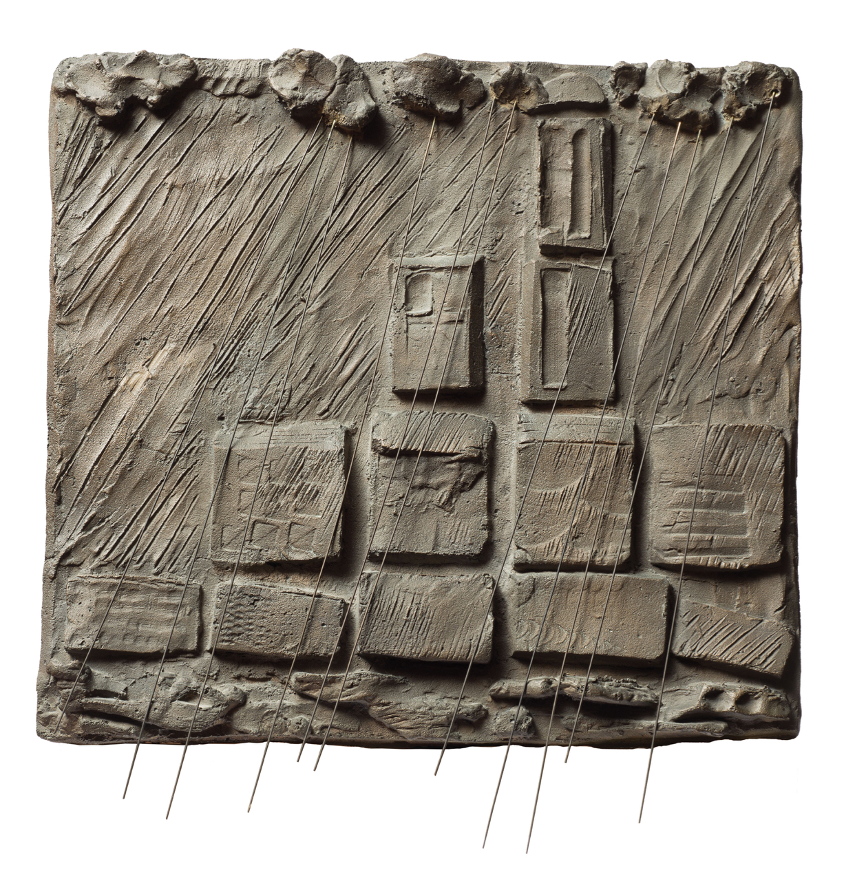 In tutta la sua produzione artistica Fausto Melotti ha subito l'influenza della sua formazione musicale, rendendo la musica un elemento costante del suo lavoro. Melotti elabora infatti un linguaggio scultoreo in cui tenta di trasporre le leggi della musica nel campo della scultura, inserendo variazioni, pause, intervalli ed intessendo un importante legame tra il pieno ed il vuoto scultoreo. «La scultura non è materia nobile, bensì rappresentazione dello spazio che tende alla resa della realtà, anche quella nascosta e invisibile» dice il Maestro riguardo la scultura, che tramite i suoi lavori sembra essersi liberata dalla monumentalità e dall'ingombranza della materia approdando ad una leggerezza sconosciuta. Nell'opera qui presentata, La pioggia sulle case in riva al fiume, è evidente come le ricerche del Maestro approdino ad una maturità stilistica: il ritmo è scandito da sottili fili metallici che dividono lo spazio scultoreo in vari moduli e sequenze, creando delle unità stilistico-temporali, come uno spartito. La pioggia viene raccontata poeticamente con fili sospesi leggeri e delicati, tipici del linguaggio dell'artista, direttamente agganciati al blocco in bronzo, esaltando l'armonia dell'intera composizione. Melotti elabora un personalissimo linguaggio creatosi negli anni grazie ad una molteplicità di influenze trasversali che lo hanno reso unartista completo da tutti i punti di vista: le esperienze che lo porteranno ad affiancare la sua vicenda di vita a quella di moltissime figuredi spicco della cultura italiana - dallo spazialista Lucio Fontana al designer Gio Ponti e lo scrittore Italo Calvino - arricchiranno il suolinguaggio artistico e poetico, rendendolo uno scultore difficilmente iscrivibile in alcuna categoria.