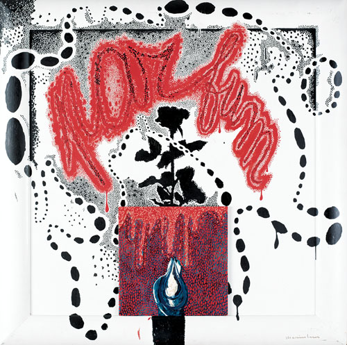 PLINIO MESCIULAM Genova 1926 Parfum, 2005 tecnica mista e applicazioni su tavola con cornice invasa cm. 95,8x95,8; firma in basso a destra, titolo, firma, anno e timbri della Galleria Rinaldo Rotta (GE) al retro, dichiarazione d'autenticità di Rinaldo Rotta e timbri della Galleria d'Arte Rotta Farinelli (GE) su tre foto.