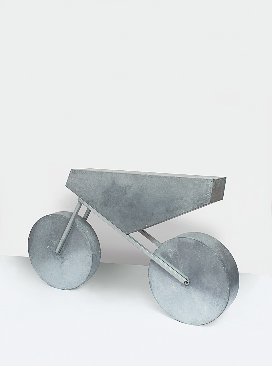 Umberto Cavenago (1959) Enduro Lamiera zincata, alluminio e acciaio inox cm 112x195x27,5 (circa) Eseguita nel 1989 Provenienza: Collezione privata, Torino Bibliografia: Umberto Cavenago, a cura di Luigi Di Corato e Antonella Soldaini, edito da Silvana Editore, Cinisello Balsamo 2006 Si ringrazia l'artista per aver confermato per e-mail l'autenticità dell'opera