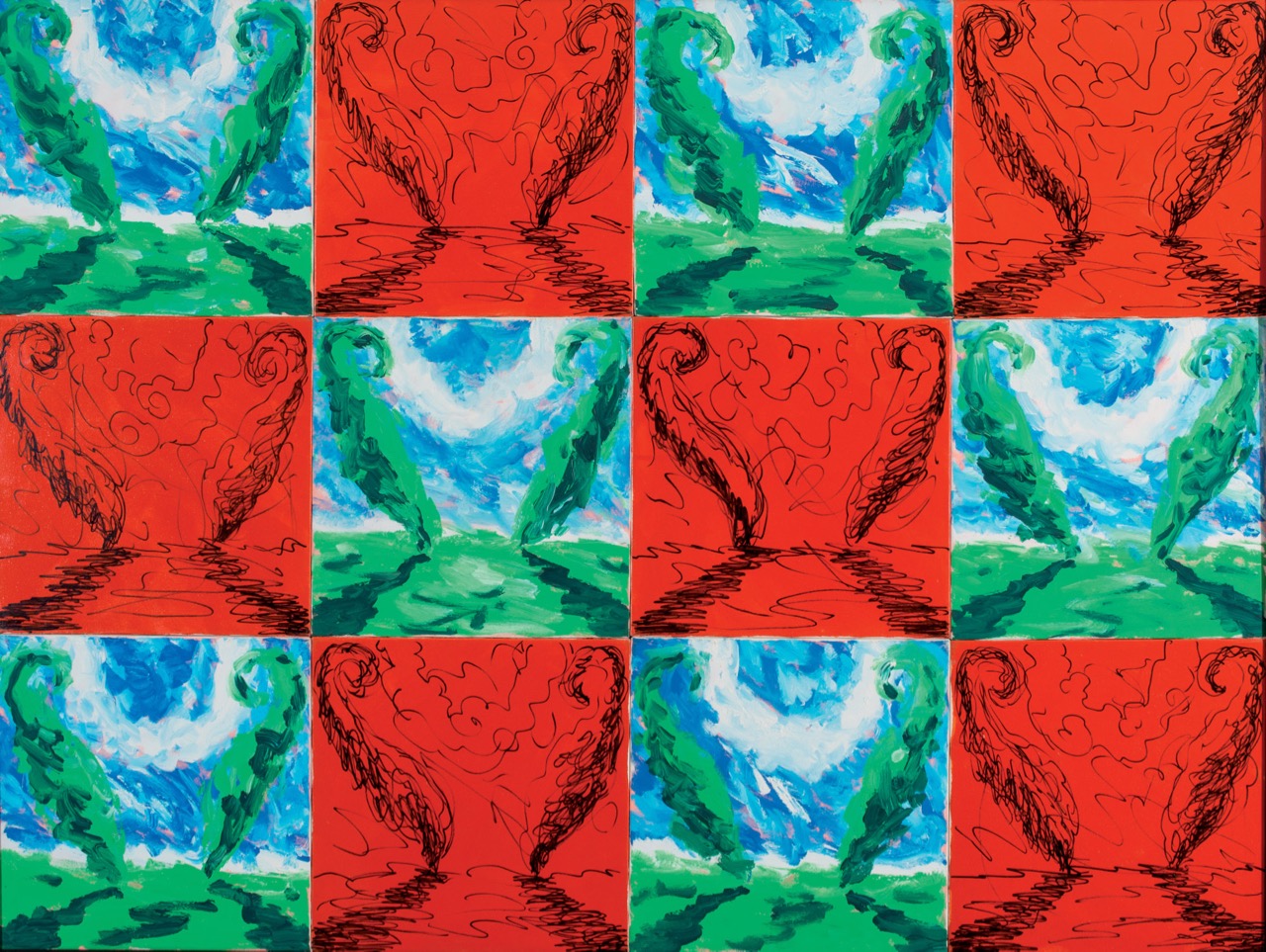 Pierluigi Pusole (1963) Senza titolo Firmato sul retro Olio e tecnica mista su 12 tele assemblate in unica cornice cm 150x200 (opera intera) - cm 50x50 (ciascuna tela) Fotografia dell'opera autenticata dall'artista Si ringrazia l'artista per aver confermato verbalmente l'autenticità dell'opera